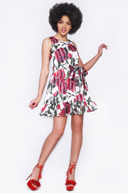 Летнее женское платье с большим цветочным принтом. Модель выполнена из легкой ткани с полупрозрачными вертикальными полосами, украшена пояском на талии и игривой рюшей снизу изделия.