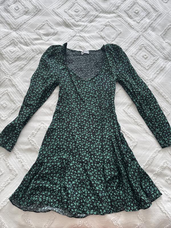 Размер М, состояние новой, одетая 1 раз Длина платья 85 см Женское платье ZARA с длинными рукавами в цветочный принт. Основа ткани черного цвета, с мелким зеленым узором. Модель имеет приталенный силуэт, V-образный вырез декольте и легкое расширение книзу, создавая эффект струящейся юбки, на спинке сборка в виде резинки. Рукава облегающие, без манжетов, сбоку имеет скрытую застежку. Ткань легкая, 100% вискоза. Идеально подходит для повседневной носки или вечерних выходов в сочетании с элегантной обувью.