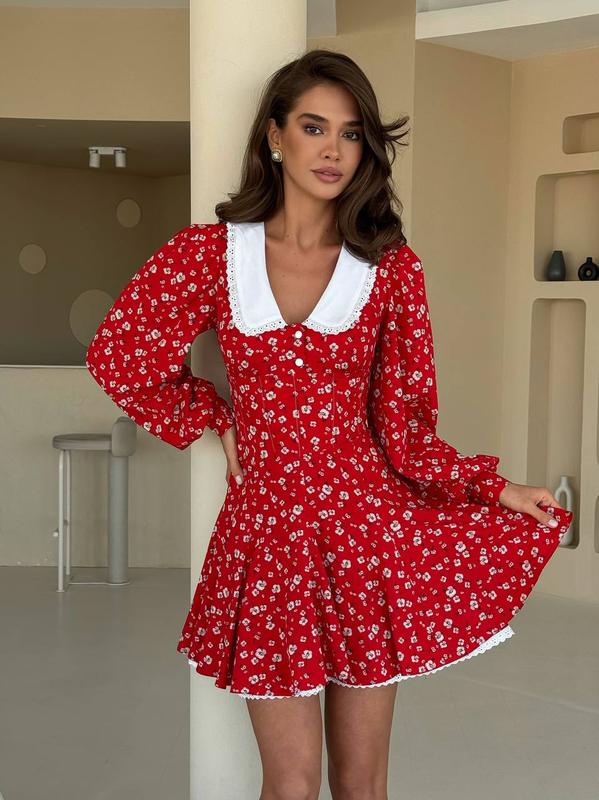 Элегантное мини платье с воротником длинный рукав цветочный принт рисунок цветы