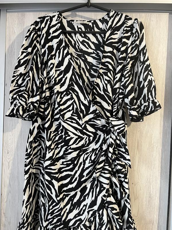 Сукня в трендовому колорі на запах. Стан новий. Розмір наш 44-46. Заміри: Довжина- 85; Плечі 10; Напів обхват під мишки 52; стегна так як сукня на запах то до 110.