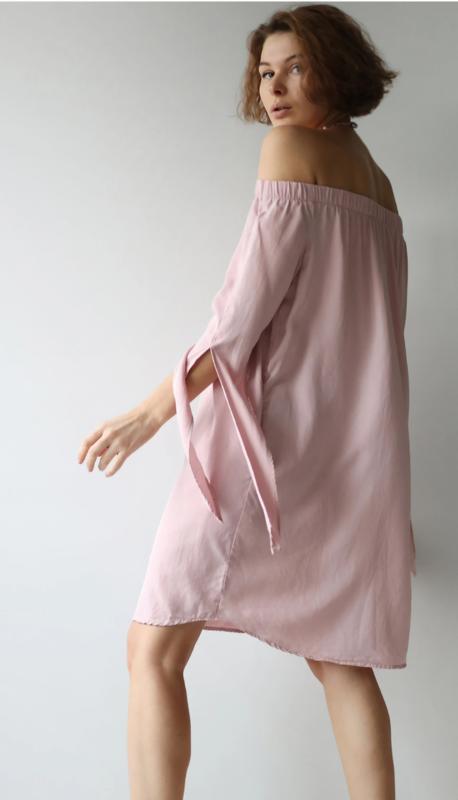 Платье прямого силуэта, имеет карманы, рукава завязываются.Ткань вискоза, легкая, не просвечивает. Бледно розового цвета, на последнем фото камера перевала цвет.