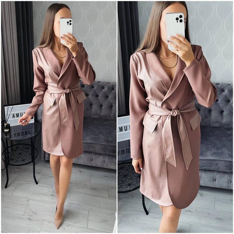 Сукня 343 Размеры 42-44, 46-48,50-52,54-56 Невероятно стильное платье-пиджак выполнено в комбинации костюмной ткани и экокожи. Фабричное качество, полностью закрытые передние полочки платья (внутренняя часть выполнена из костюма, то есть в качестве подкладки у пиджака). Внутри платье на завязке, что даст вам уверенность в носке. Декоративные клапаны выполнены из экокожи, карманы отсутствуют. Спинка выполнена из костюмки. В комплекте идет кожаный пояс