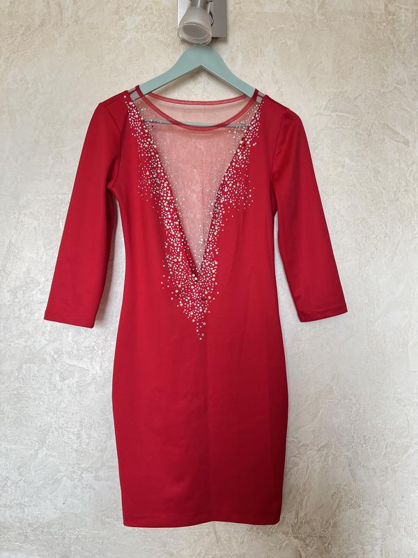Красное платье мини, плотный трикотаж, приталенное, рукав 3/4, размер S.