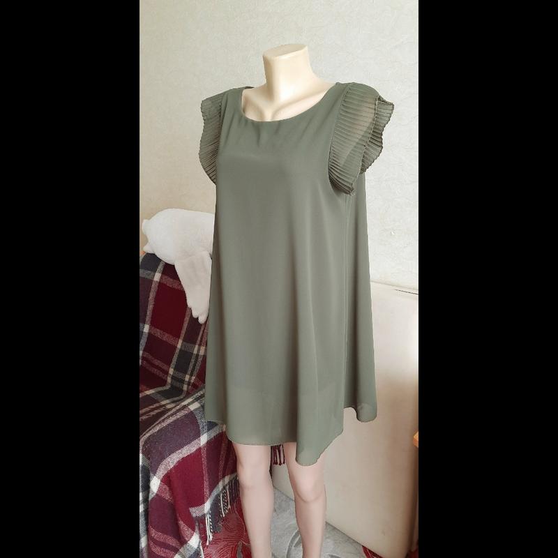 Короткое летнее платье свободного кроя. Цвет хаки. Состояние очень хорошее. Размер S/M. На невысокую женскую, так как внутренняя часть платья короче прозрачной части. Ширина плечей 34 см Полуобхват груди 52 см Длина 87 см (в середине 70+/-).