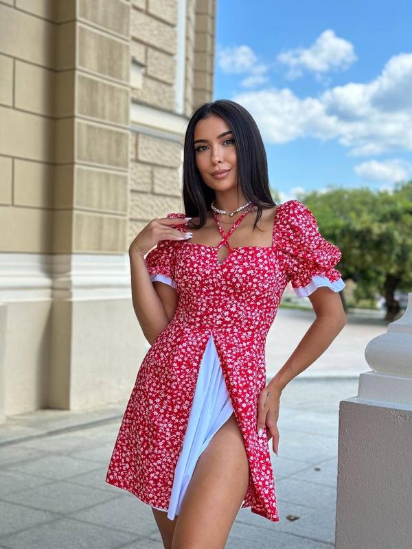 Красивое летнее платье в цветочный принт с завязкой на шее и короткими рукавами фонариками
