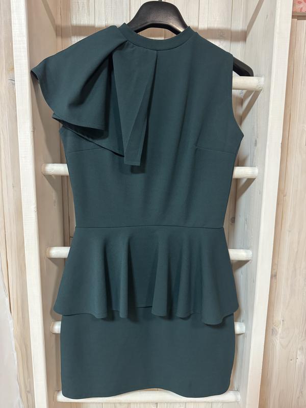 Платье мини, с баской и асимметричным рукавом. Цвет - темный изумруд. Размер 44. Состояние идеального