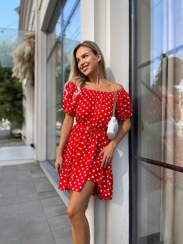 Платье в гороховый принт асимметричного кроя с поясом и открытыми плечами