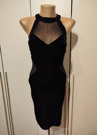 Женское платье черного цвета, ткань бархат, комбинированное сеточкой и с открытыми плечами и спиной, приталенная ПОГ -35 ПОТ-29 ПОС-39 Длина платья 89