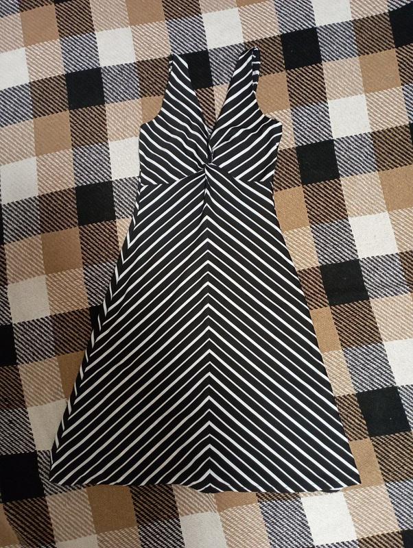 черно-белое платье с V-образным вырезом. Модель имеет широкий расклешенный низ и приталенный верх, подчеркивающий фигуру. Стильный геометрический принт с полосками добавляет элегантности и визуально вытягивает силуэт.
