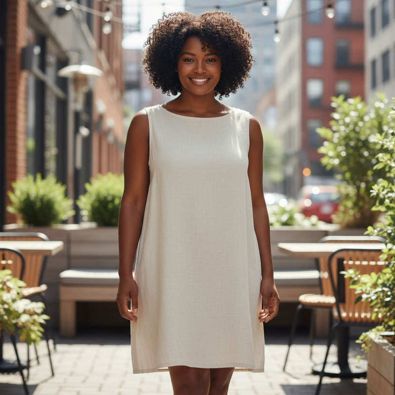 Платье без рукавов серо-бежевого цвета. Изготовлена из смесовой ткани 55% льна и 45% вискозы. Вырез "лодочка", спинка открытая. В боковых швах карманы. Стан идеальный размер по бирке 20. Замеры: под руками - 56см, бедра - 65см, длина - 95см.