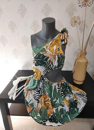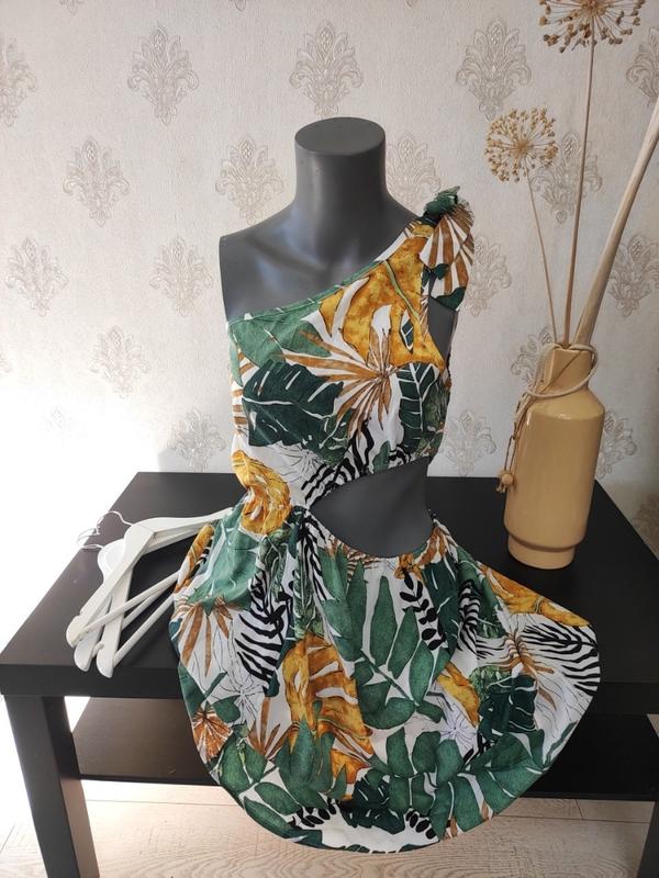 сукня жіноча літо . Розмір довжина 88 талія. 70-78 груди. 95 Ця сукня випромінює атмосферу літа, тепла та безтурботного відпочинку. Вона виготовлена з легкої тканини з яскравим тропічним принтом, де поєднуються насичені зелені листя, золотисті монстери та чорно-білі анімалістичні візерунки. Модель має оригінальний крій з асиметричною верхньою частиною на одне плече, що надає їй витонченості та грайливості. У зоні талії є виріз, який підкреслює силует і додає нотку пікантності. Спідниця розширюється донизу, створюючи легкий, повітряний ефект, що робить її ідеальним вибором для літніх прогулянок, пляжного відпочинку або вечірніх виходів. Ця сукня – справжнє втілення літнього настрою, легкості та природної краси!