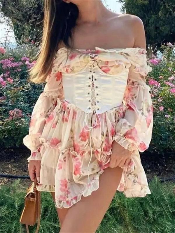 Шифонова пишна сукня з рюшами та ковтком з квітковим принтом