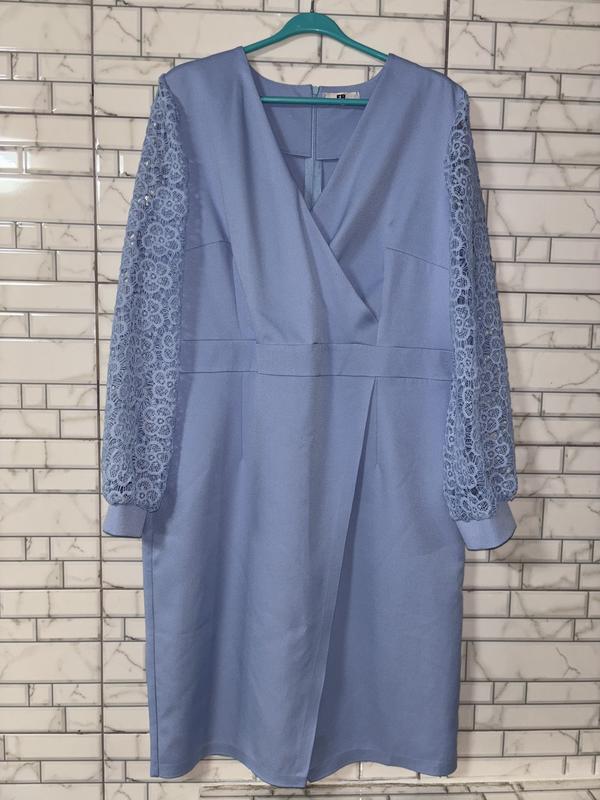 Невероятно красивое платье на запах голубого цвета Длина 104 Пог 54+, есть вы точки, идете на запах Пот 49,5 Поб 60 Рукав 65, на манжете, плечи 41 Есть фото на теле, скину по необходимости в сообщения!
