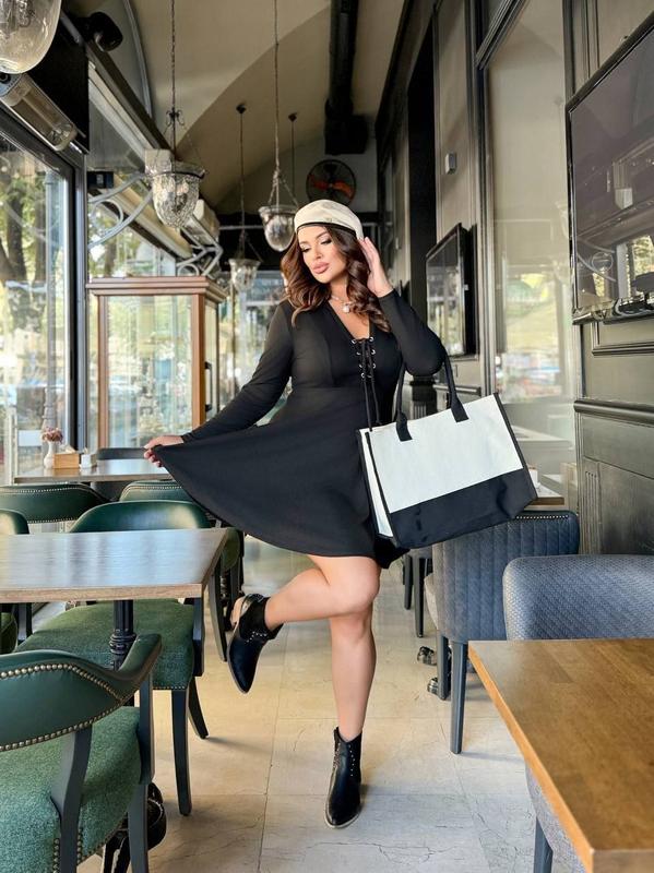 Прогулянкова сукня. Сукня, приталена по верху, низ - напівсонце, попереду розріз зі шнурівкою. Тканина мустанг рубчика, дрібна гладка структура. Тканина добре тягнеться. Склад: Поліестер - 95%, Бавовна - 5%. Колір: Чорний, Вишня, Бежевий Розміри 46-48, 50-52, 54-56, 58-60. Мерки 46-48 Об'єм грудей - 88 см (розтягується 96 см), Об'єм талії -68 (розтягується до 86 см), Об'єм стегон - 168 см, Довжина сукні - 84 см, Довжина рукава - 55 см 50-52 Об'єм грудей - 96 см (розтягується 104 см), Об'єм талії -76 (розтягується до 92 см), Об'єм стегон - 174 см, Довжина сукні - 84 см, Довжина рукава - 56 см 54-56 Об'єм грудей - 104 см (розтягується до 112 см), Об'єм талії - 84 см (розтягується до 100 см), Об'єм стегон - 180 см, Довжина сукні - 85 см, Довжина рукава - 57 см 58-60 Об'єм грудей - 112 см (розтягується до 120 см), Об'єм талії - 92 см (Розтягується до 108 см), Об'єм стегон - 186 см, Довжина сукні - 86 см, Довжина рукава - 58 см ет