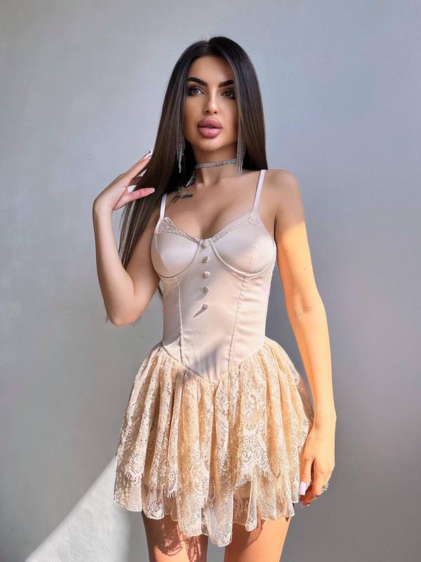 Атласный ромпер бюстюе, платье-комбинезон с кружевом, атласное платье мини с кружкой, вече...