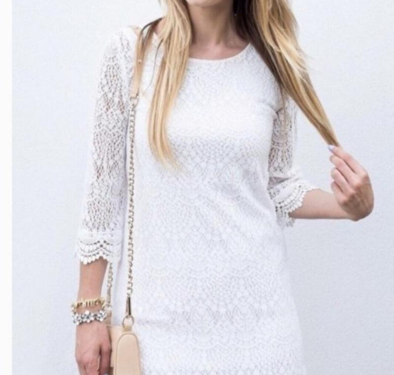 Нарядное кружевное платье от H&M. На подкладке. Форма - трапеция. Размер XS-S. Фактические замеры: обхват в грудях 80-90см в талии до 84см в стегнах до 90см Длина платья 83см длина рукава 44см пройма рукава 23см ширина рукава 15см ширина платья по низу 53см