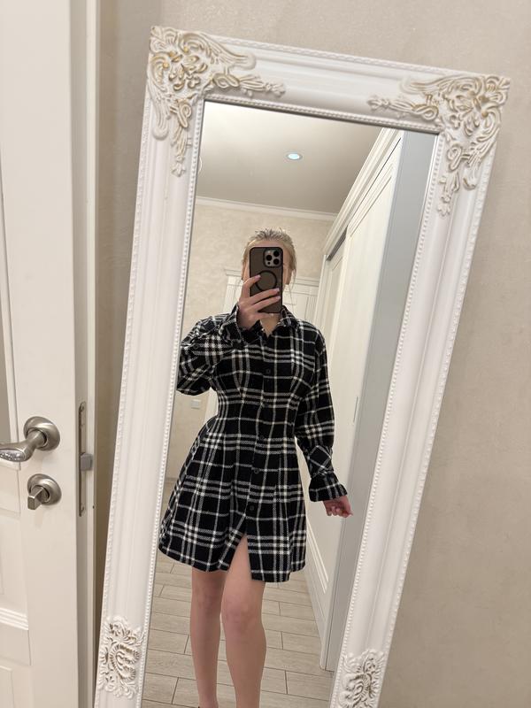 Затишна сукня турецького виробника з воротником, приталена, на рукавичках акцентні ремінці на ґудзиках, які можна зняти, сама сукня також застібається на ґудзики, приємне на дотик, на розмір хс-с, одягнуто на параметри- ог-85 см, от-65 см, об-95 см. Зріст-165 см.