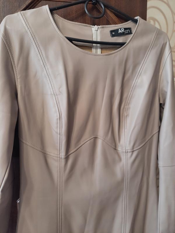 Мини платье из кожзама, размер М но поскорее то С-ка. Подмышками 44 см, полуобхват талии 36 см, полуобхват бедер 48 см, длина 90 см, бежевый мокко.
