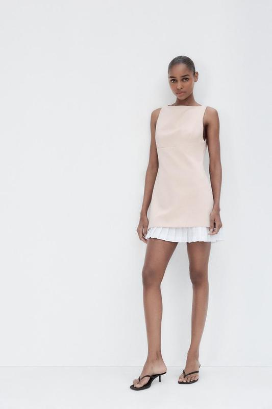 Короткое платье без рукавов с воротником лодочкой. Контрастная подкладка с бантовыми складками по низу. Скрытая молния сзади. Светлый цвет загара. S, М, L, XL. Отправка 5-6 дней после оплаты.