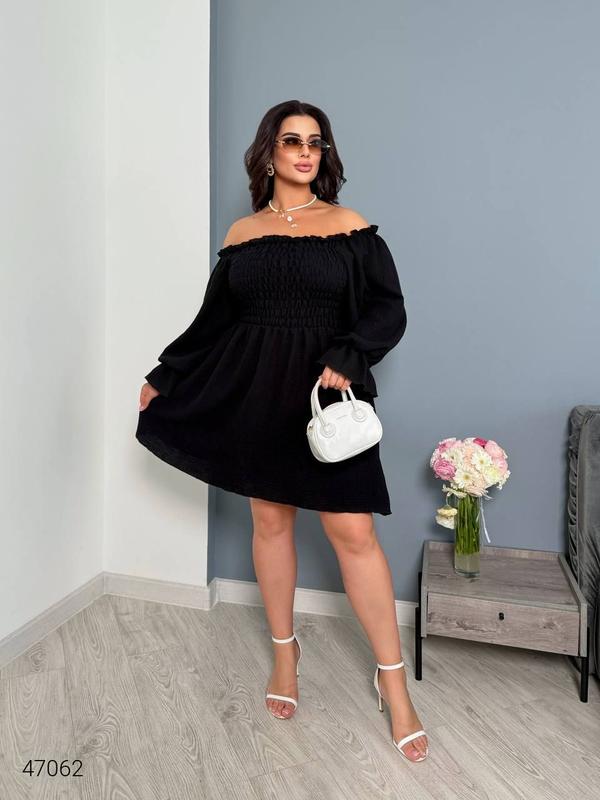 Платье мини с открытыми плечами. Объемные рукава. Расширенная к низу юбка. Платье прошито резинками, которые мягко тянутся, что позволяет красиво сесть по фигуре. Ткань: муслин (натуральная ткань, красиво носится, дышащая, жатый эффект - поэтому не мнется). Размеры: 42-46, 48-54 Замеры: 42-46: ОГ – 74 – 110 см. Длина – 79 см общая и 44 см от талии. 48-54: ОГ – 100 – 130 см. Длина – 89 см общая и 49 см от талии.