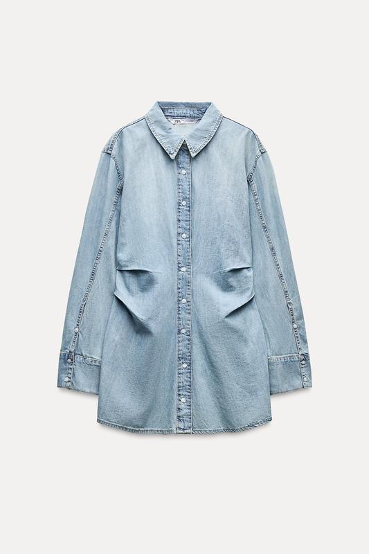 Стильное короткое джинсовое платье рубашка из свежих коллекций Zara. Размер L. В очень хорошем состоянии без дефектов. Ткань 100% хлопок, тонкий, плотный джинс, не тянется. На талии с драпировкой. Замеры груди 48см, талия 42см, бедра 52см, длина от плеча 82см