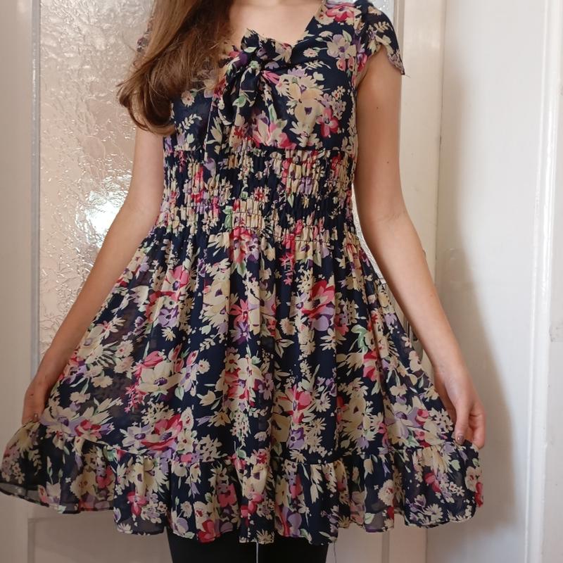 Предлагаю прекрасное летнее платье из шифона, есть трикотажная подкладка. Размер 12, замеры: ПОГ-51, талия-35 (резинка в шесть рядков, тянется), бедра -65, снизу оборка. Длина -80. на груди капелька и завязывается бант. Рукава-крилишки . Состав -100% полиэстер. Стан идеален.