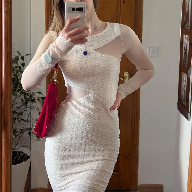 Белое платье с легкой драпировкой и вставками из сеточки. Ткань белая с мелким вкраплением золотых нитей. Рукава сетчатые. Седает по фигуре на худи отчину, грудь до 2-го размера, платье без застежек