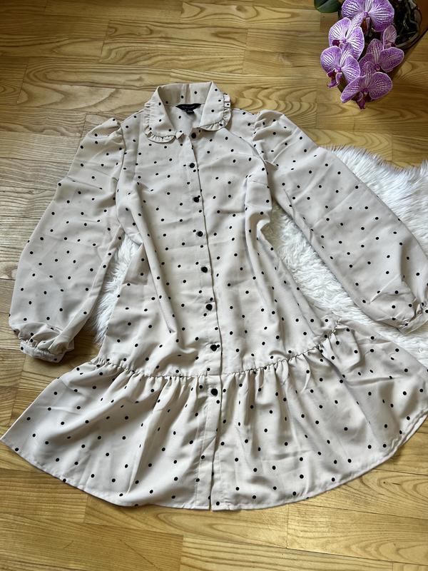 Бежевое платье, платье рубашка в горох от New Look. Вдоль на пуговицах, с объемным рукавами. Размер968/S Замеры: Длина 89 Плечи 35-37 ПОГ 45-47 ПОТ 49 ПОБ 56-58
