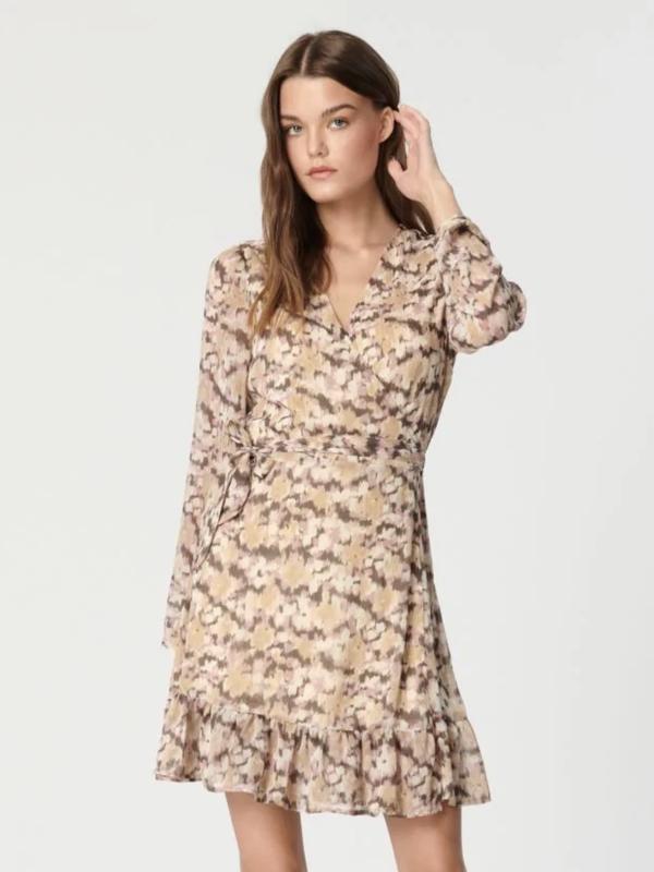 Стильний принт у м’яких бежево-коричневих тонах створює витончений образ, а зручний фасон із запахом підкреслює талію та додає жіночності. Довгі рукави, V-подібний виріз і легка оборка по подолу роблять сукню ідеальним варіантом як для повсякденного носіння, так і для особливих подій. Деталі: • Матеріал: легкий шифон • Фасон: сукня із запахом, довжина до коліна • Рукав: довгий, напівпрозорий • Принт: абстрактний у природних відтінках • Декор: зав’язка на талії, оборка по низу