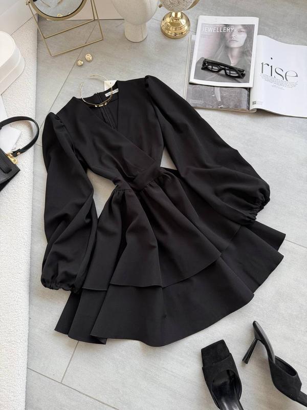 Изысканное платье воздушное черная с длинным рукавом ярусная юбка, платье