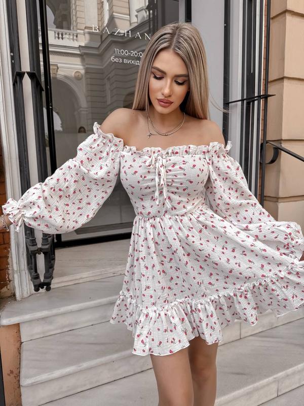 очень нежная и романтичная, на комлекте рюш, декоративная завязка; с длинным рукавовым фонарик на резинке, талия на резинке, спинка прострочена; юбка широкая, по низу присборенная оборка🌸🌷 Арт. 10470 Ткань: качественный натуральный принтованный "Муслин", состав 100% хлопок. ткань: Турция, очень приятная на ощупь хорошее качество ткани и пошива🌸 Цвета: белый (розовая веточка),белый ( малиновый бутончик), белый (розовый тюльпанчик) Размер: с-м(42-44) Об.. гр. до 92 см. Об.талии до 70 см. Длина 83 см. Размер: м-л(46-48) Об. гр. до 98 см. Об.талию до 78 см. Длина 86 см.