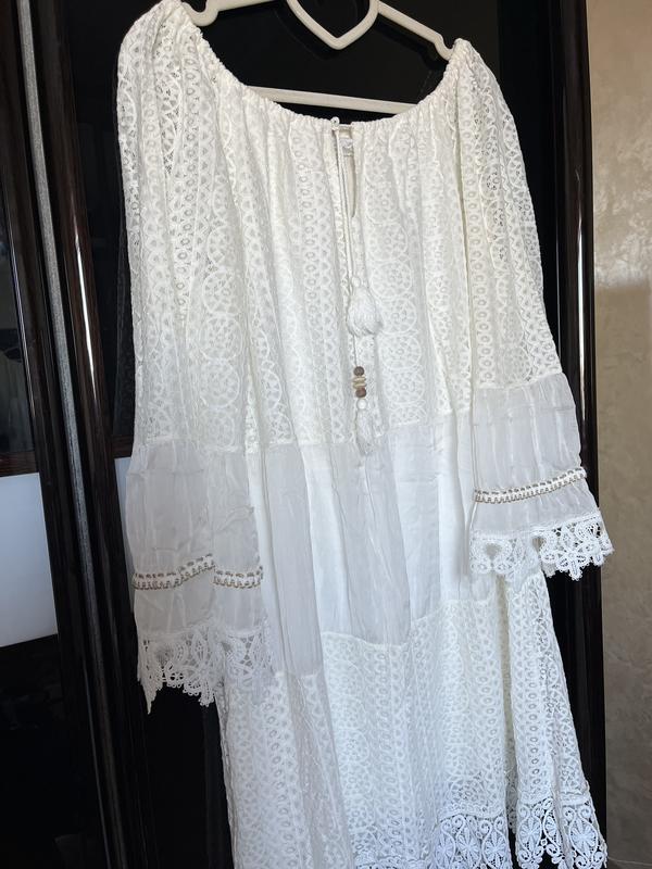 Сукня, туніка з вмістом шовку та котону. Колір молочний.Має підкладку. Дуже красиво виглядає, чудовий літній , святковий варіант. Пог 54см, довжина 87см, по низу 76см.