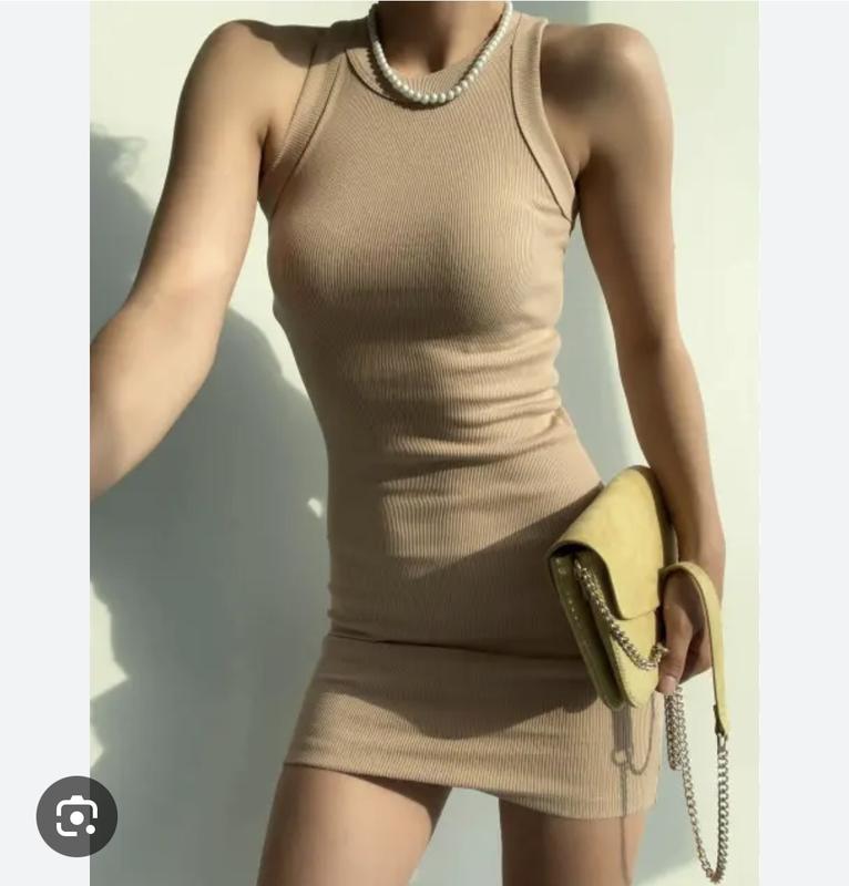 Базовое короткое платье-майка в рубчик из ребристого трикотажа в бежевом цвете. Подойдет для повседневного использования