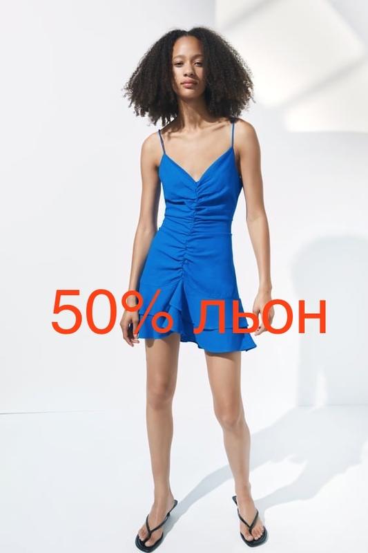 Сукня від ZARA, з останніх колекцій, розмір вказаний XS. Сток, стан нової, торгу немає! Склад: 50% льон, 50% віскоза. Заміри: Пог ( від одної подмишки до іншої ) 38 см якщо завязка максимально стягнута, на будь який більше обʼєм регулюється; Пот 31 см, ззаді резинка 40 см; Поб 45 см; Довжина від подмишки по боковому шву 57 см.