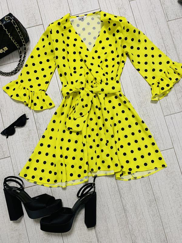 Женское яркое платье в желтом цвете в горох в размере xs-s с поясом и на запах