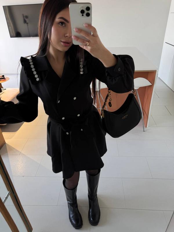 Пиджак - платье ✨ Модель 3078-1467 ▫Тканина: костюмка ▫Размерный ряд:42-48, 48-52 ▫Цвет: черный Фото Реал Притягивающий взгляды пиджак-платье ✨ Если ты любишь стильные и выразительные вещи – этот пиджак-платье создан именно для тебя! 😍 Идеальный баланс между классикой и современным акцентом, который точно не останется без внимания❤️ 💎 Изюминка модели – эпатажные пуговицы, придающие характер и делающие образ незабываемым
