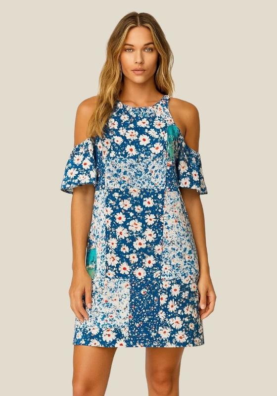 ✔️ Брендовое платье ZARA ✔️ Лёгкий летний фасон с открытыми плечами (cold shoulder) ✔️ Свободный крой — комфортно садится на размеры S и M ✔️ Яркий пэчворк-принт: комбинация цветочных узоров в сине-бело-зелёной гамме ✔️ Длина до колена ✔️ Круглая горловина с декоративной сборкой ✔️ Лёгкая, шифоновая приятная к телу ткань ✔️ Застёжка на пуговку сзади на шее Замеры: - длина от плеча 86 см - ПОГ 46 см - ПОБ 54 см