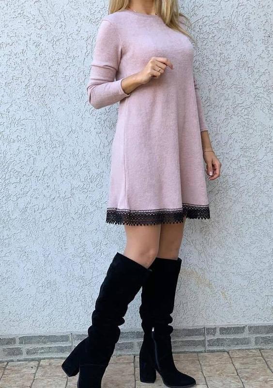 Ніжна сукня з мереживом Виготовлена з м’якого ангора , вона приємна до тіла та добре тримає форму. Деталі: • Колір: пудрово-рожевий • Довжина: вище коліна • Крої: прямий, вільний • Рукав: довгий • Декор: чорне мереживо по низу • Матеріал: ангора