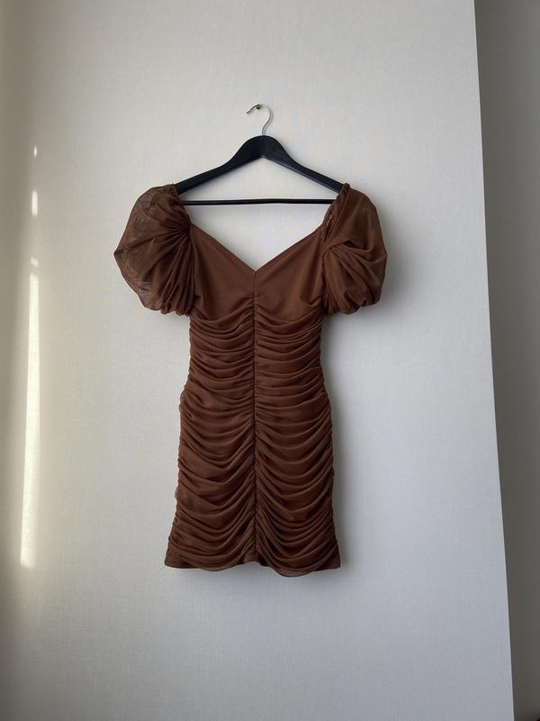 Сукня жіноча міні коричнева в сіточку зі збіркою вздовж Бренд asos Розмір - xs ( s ) Підійде на зріст до 160 см Сезон : літо Рукава воланчиками Стан нового , без дефектів Мені не підійшов розмір