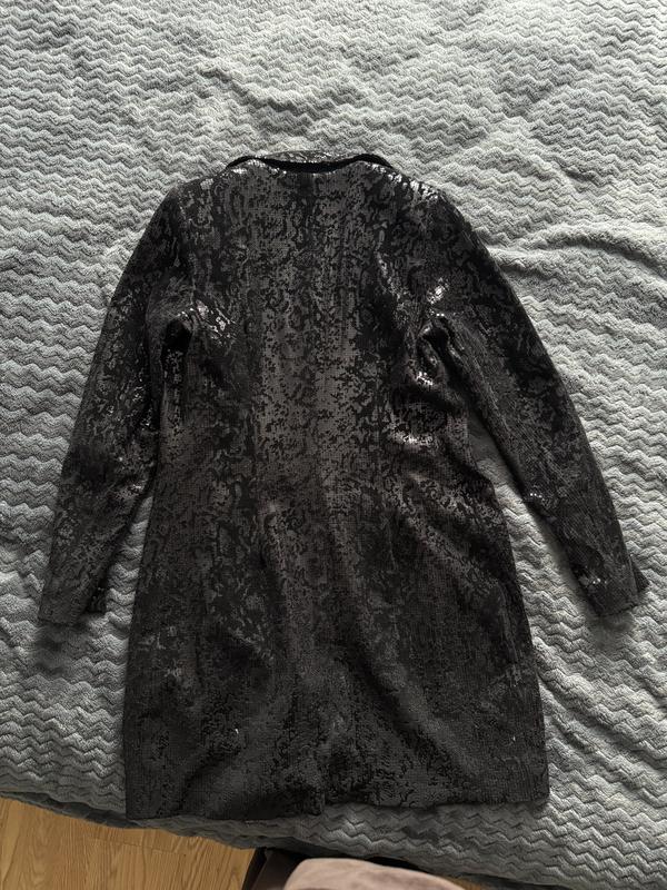 Сукня піджак в чорному кольорі, який переливається з блискітками - в ідеальному стані Спереду защіпається на ґудзики Розмір s Довжина від рукава: 81 см Довжина рукава: 58 см