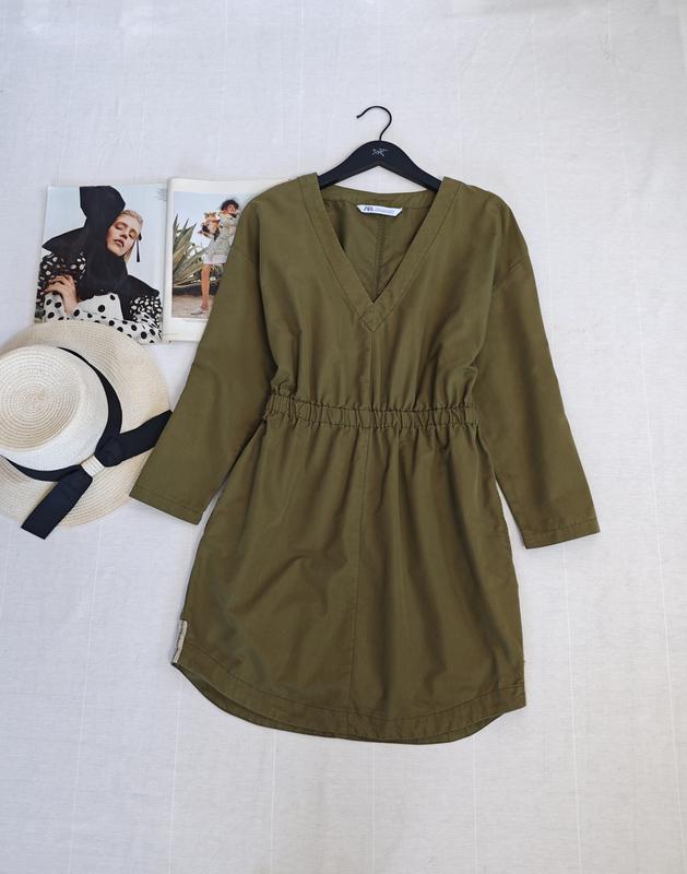 🌿плаття хакі від Zаra вільного крою з бічними кишенями, талія на резинці, тканина цупка, 62% котон, 38% поліамід Розмір:XS Заміри:ПОГ 52 см, талія 38 см, ПОБ 53 см, довжина 86 см, рукав від горловини 60 см