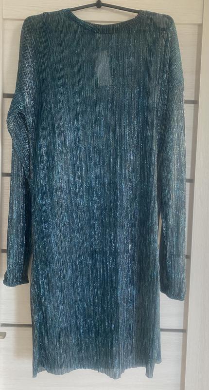 Сукня двійка, зеленого кольору з сріблястою люрексовою ниткою( з етикеткою), під низом сукня на брительках , зверху сукня напівпрозора з довгим рукавом . Рукав на резинці. Всі заміри на фото, за додатковою інформацією пишіть
