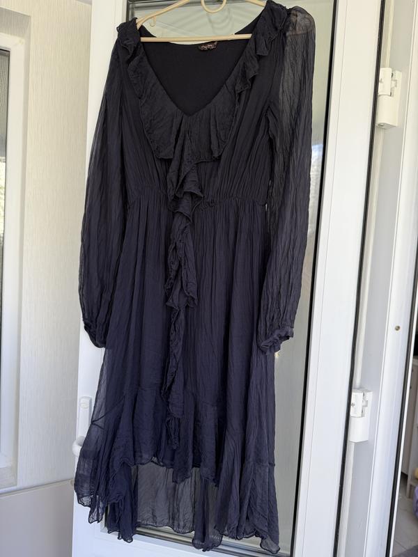 Гарна платья,сукня.темно-синього кольору.виалія,шовк.розмір М.плаття має вигляд мʼятий(такий ефект шовку і має бути)