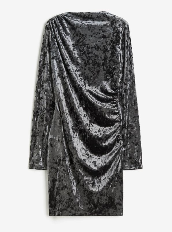 Велюровое короткое платье, размер М. Драпировка по плечу, длинный рукав, силуэт приталенный.