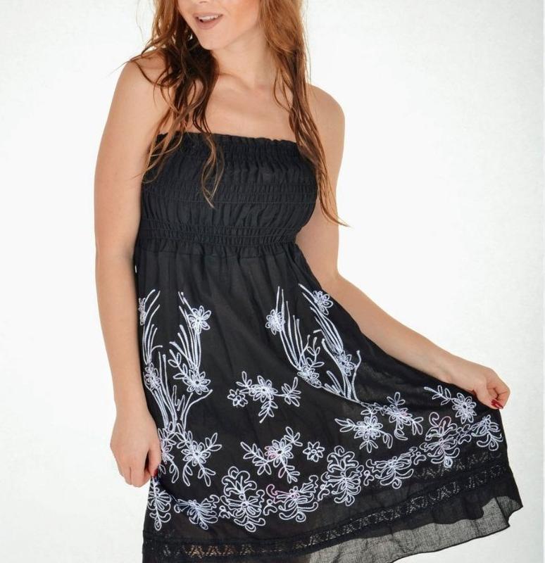 ❤ Невероятно красивое, соблазнительная легкая сатиновое черная мини платье-сарафан в бельевом стиле, украшенная лелетками и роскошной вышивкой шелком создана для тех, кто мечтает быть стильной и волшебной, даже в самую жаркую погоду. Платье имеет эластичный, в рассыпках серебристых блесток лиф, регулируемые эластичные бретельки, и свободного кроя юбочку, расшитую шелковыми цветами - выглядит изысканно и очень круто! Универсальная невесомая нарядная вещь: можно носить как тунику, платье или как юбочку - для отдыха это действительно идеальный вариант! Параметры (измерения без натяжения ткани): Ширина по линии груди - 33-45 см Ширина по линии талии - 28-40 см Высота эластичного лифа - 17,5 см (+ бретели) Ширина по линии бедер - 55 см Длина изделия - 73+ см (регулируется бретелями) Растяжимость основной ткани: отсутствует. Состав: см. фото с биркой.