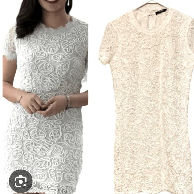 чарівна біла міні сукня з мереживом від відомого європейського бренду, спереду шикарне мереживо, рукави з мережива, ззаду плотний трикотаж.