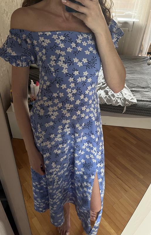 Сукня літня з відкритими плечима, блакитна з принтом, є розріз на одній стороні. Розмір підійде на хс-м, оскільки ззаді на завязках можна регулювати обʼєм грудей та талії, стан ідеальний, заміри пог 42 пот 39 заміри в вільному стані , із не затягнутими завязками! Довжина 110 , мій ріст 167 см тканина софт