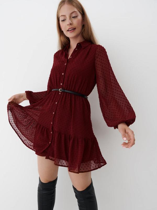 Платье Mohito бордового цвета, размер 40 (м-л). Зарекомендовало еще до войны из Польши Качественная ткань Длина 88 см Рукав 60 см По грудях 50 см В поясе на резинке Совершенно новая не носилась