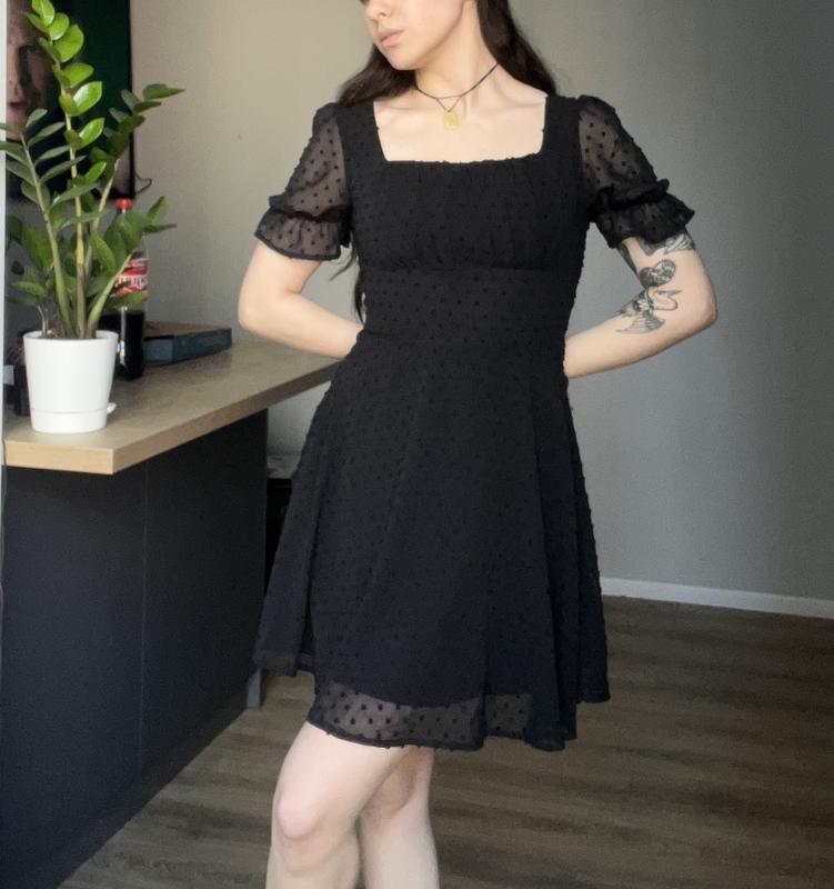 Елегантна чорна сукня в романтичному стилі з квадратним вирізом. Матеріал: легка тканина з фатиновою накидкою в дрібний горошок. Фасон: приталений верх, трішки розкльошена спідниця, короткі рукавчики-ліхтарики. Особливості: квадратний виріз, м’яка підкладка, зручна посадка по фігурі. Стан: відмінний, без дефектів. Ідеальна для побачень, фотосесій, особливих подій чи просто прогулянок і будніх днів. Розмір: XS, або маленька S