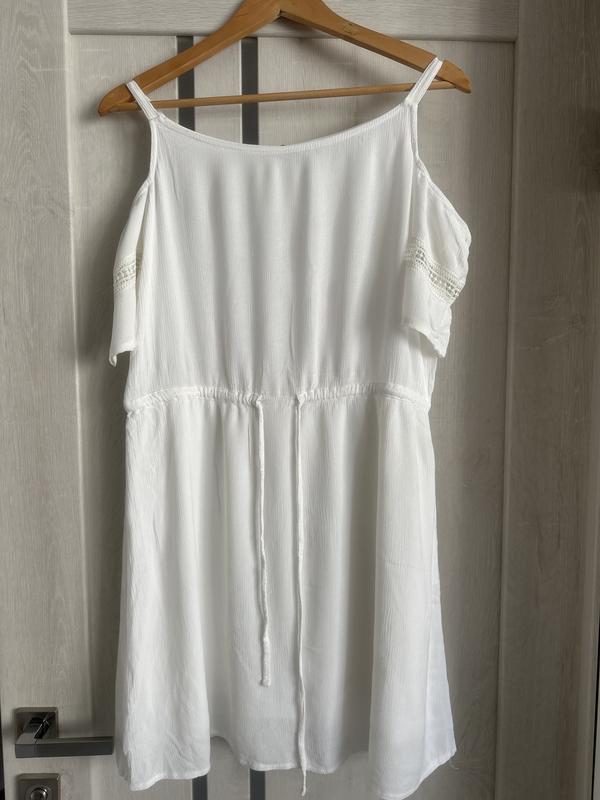 Коротка літня біла сукня, на кулісці, розмір 36. Є невеличкий дефект зі сторони спини під пахвою( розійшлась тканина, фото додаю)
